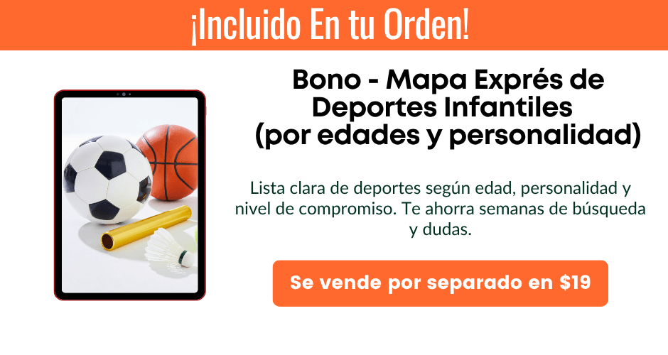 Un PDF visual con una lista clara de deportes según edad, personalidad y nivel de compromiso. Te ahorra semanas de búsqueda y dudas. Valorado en $19